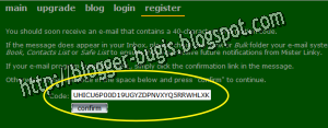 - Klik tautan / Link yang ada di bawah kode yang di berikn Mister Linkies. Halaman Mister Linky akan terbuka di tab baru dengan tampilan seperti gambar di bawah ini. Masukkan kode yang anda terima di EMAIL pada kotak putih lalu klik tombol "CONFIRM"